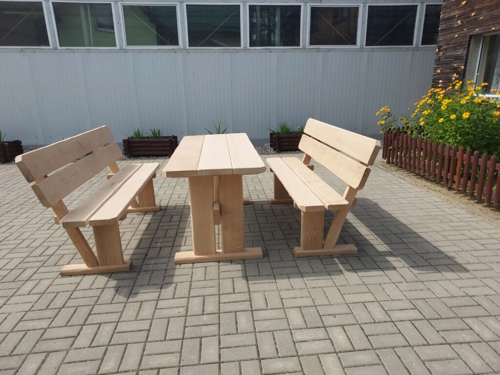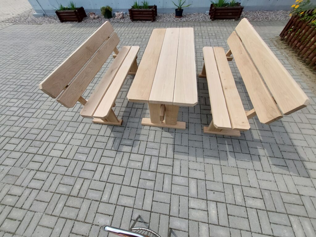 Komplet ogrodowy z litego drewna dębowego wymiary:stół długość 180cm ,szerokość ok.73cm,ławka długość 180cm,szerokośc ok.37cm grubość desek 45mm,wykonujemy również inne wzory mebli dębowych